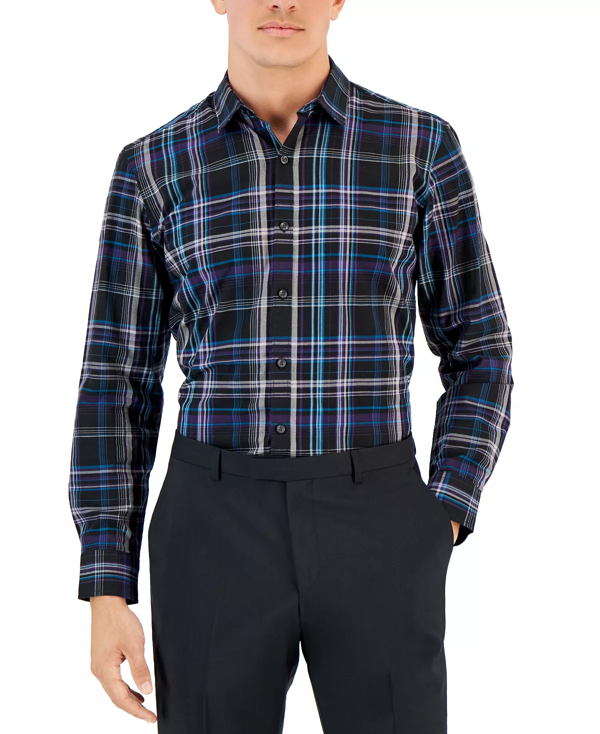 Keep your look classic and charming with this Feliz long-sleeve shirt from Alfani, in an eye-catching plaid pattern.