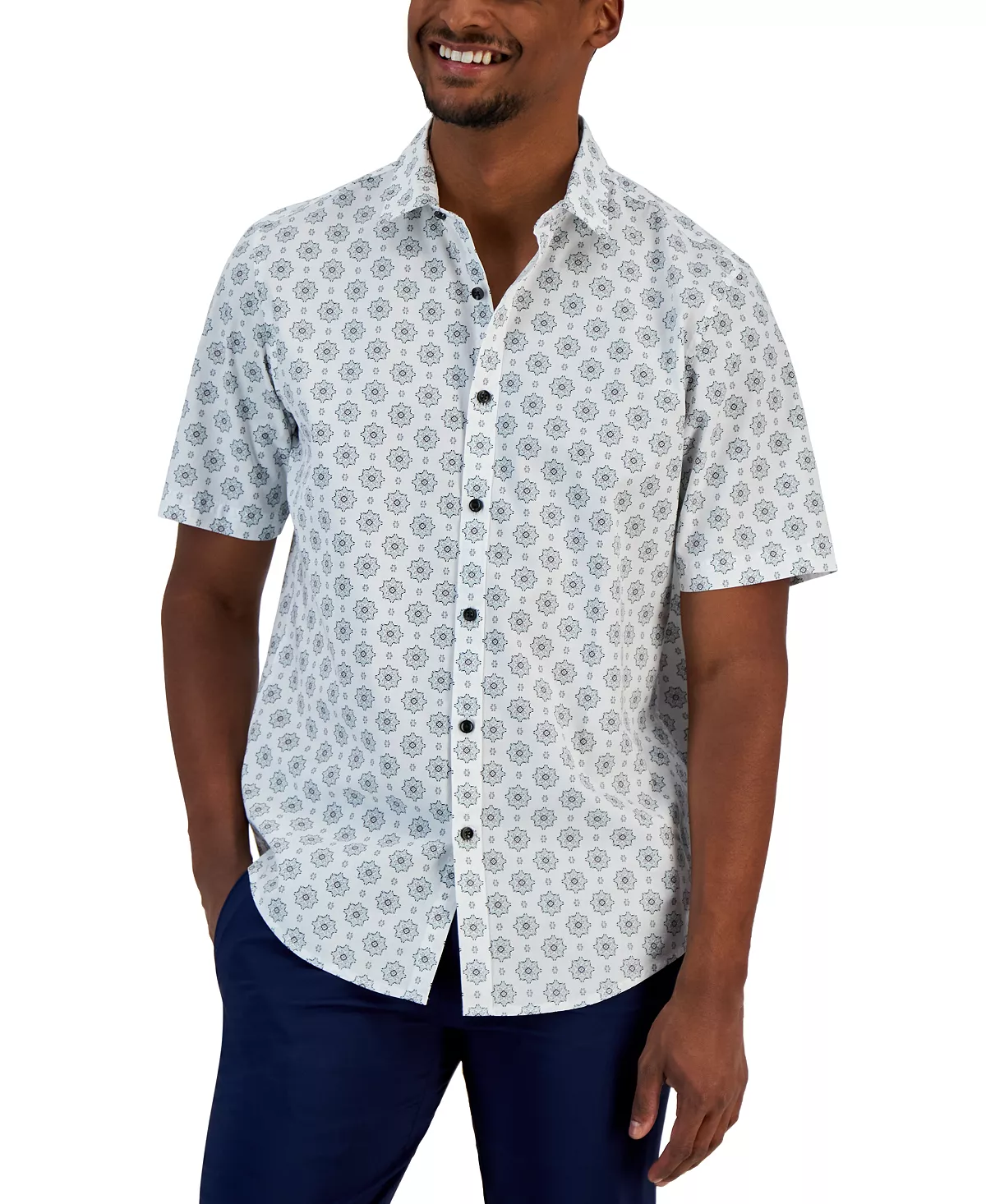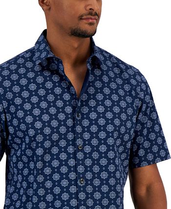 Instantly upgrade your laid-back look with the pattern of intricate medallions printed on this Manu cotton shirt from Alfani.