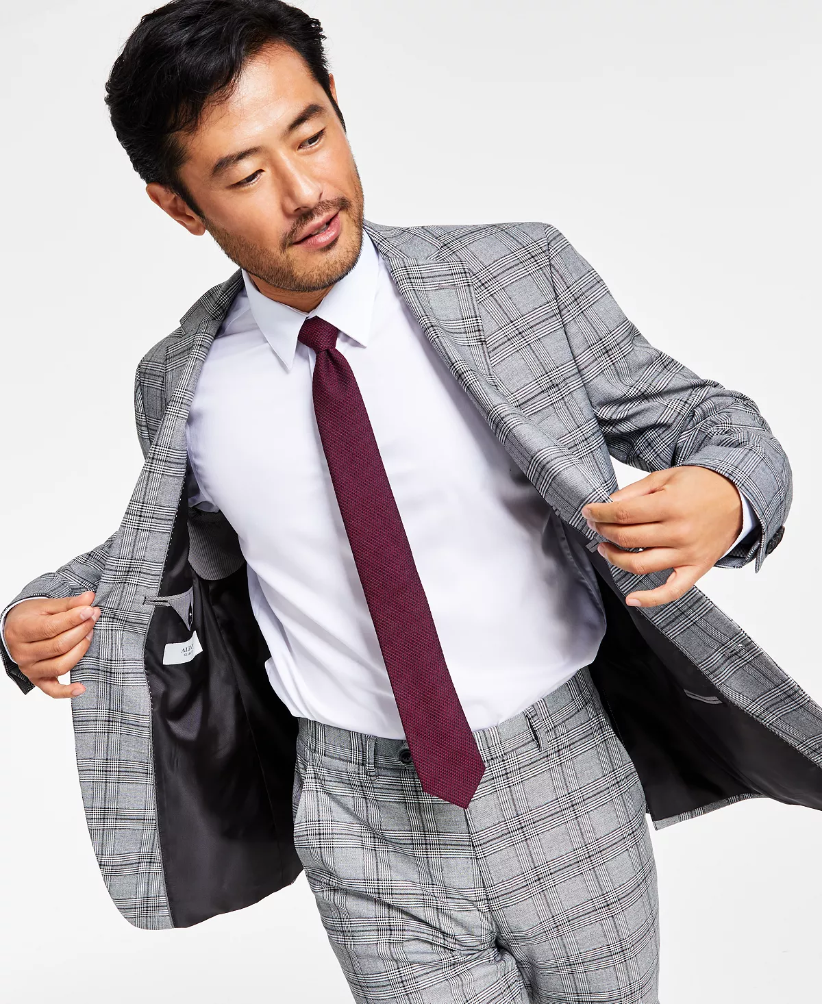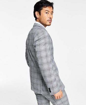 Add a modern edge to your professional look with this slim-fit suit jacket from Alfani, featuring and allover black and white plaid print and a notch lapel.