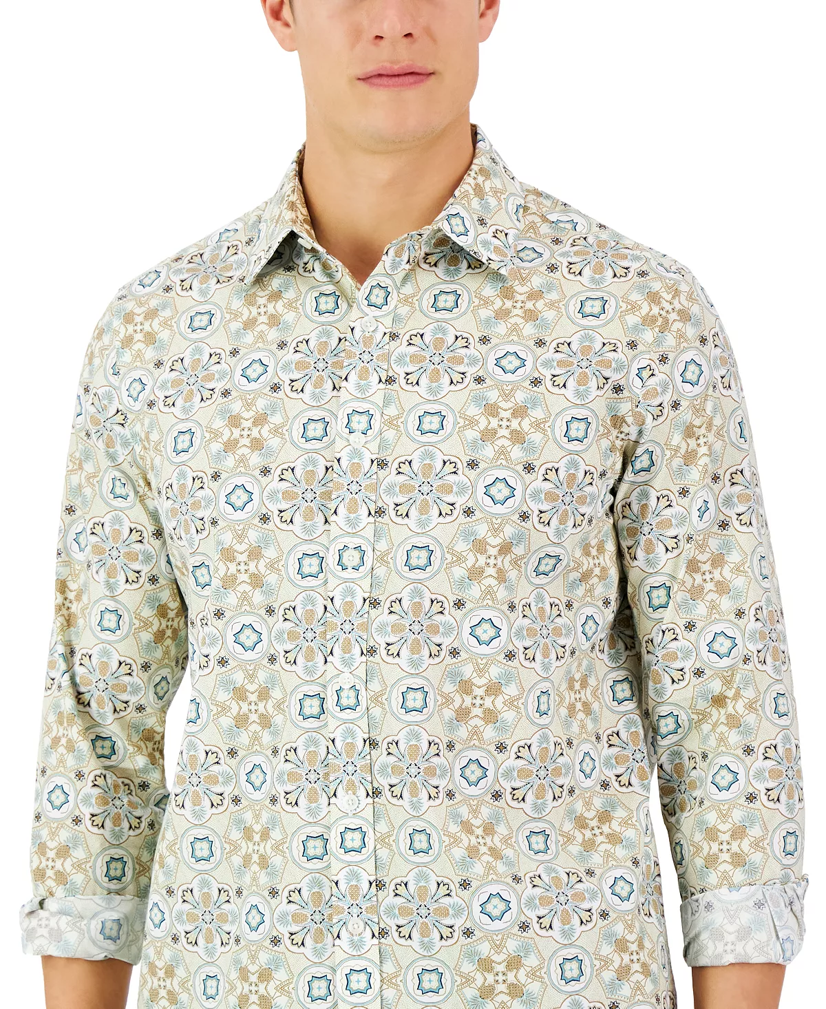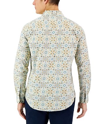 A long-sleeve shirt from Club Room, featuring classic button-down styling, allover medallion print and woven fabrication.