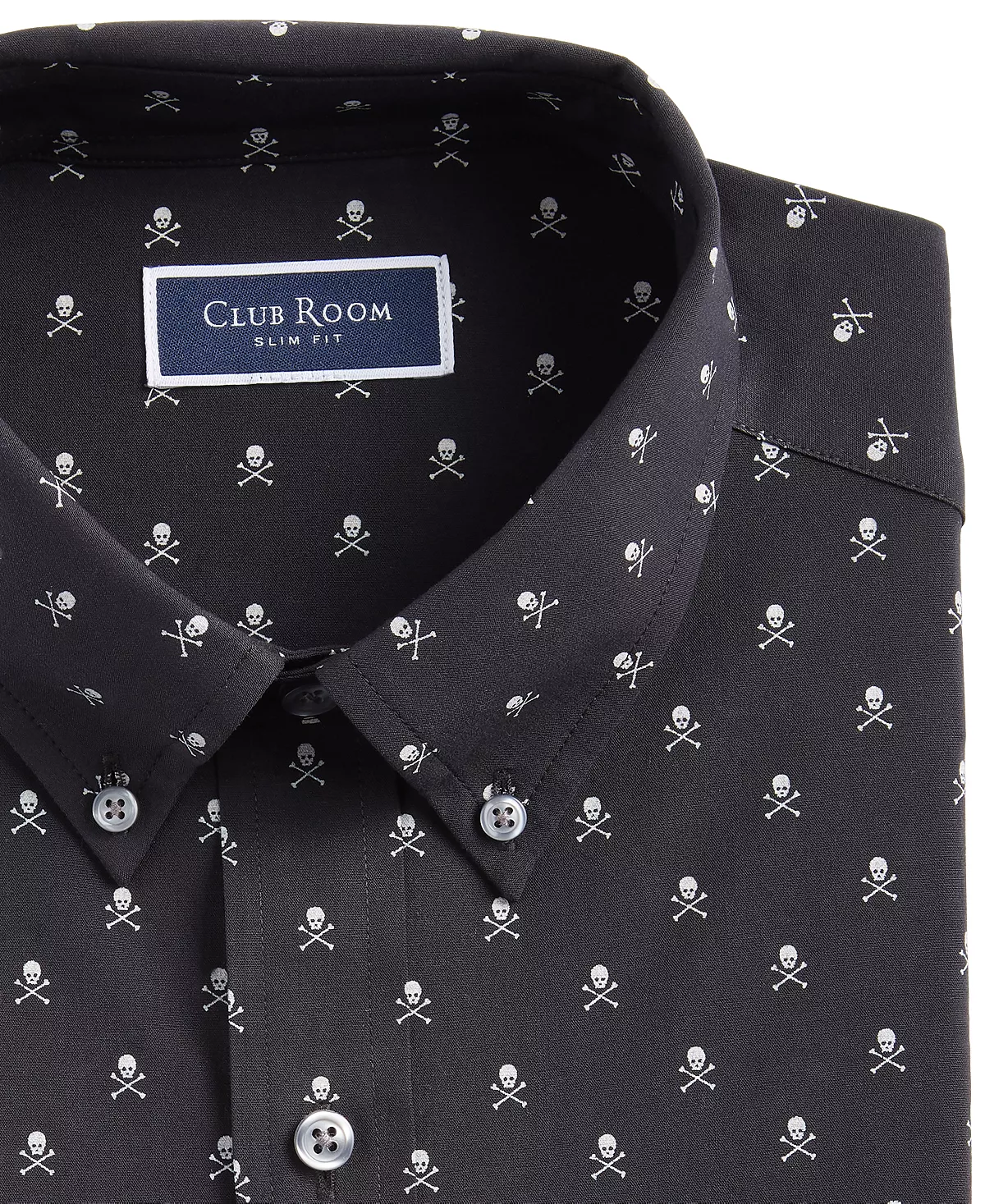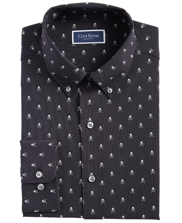 Printed from collar to hem with an army of skulls and crossbones, Club Room’s slim-fit dress shirt is designed with versatile four-way stretch fabric that keeps you loose and on top of your game in any setting.