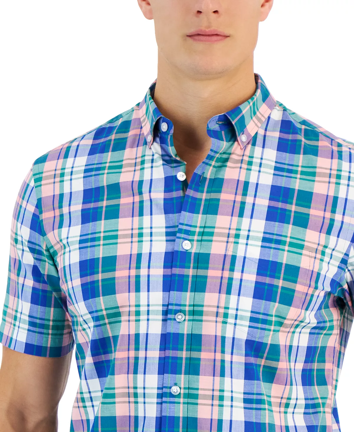 - Plaid pattern; patch pocket at left chest