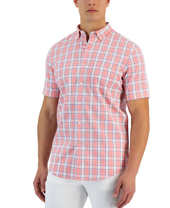 In a stylish plaid pattern, this short-sleeve, button-down shirt from Club Room is in comfortable, stretch-cotton fabric for an easy fit.