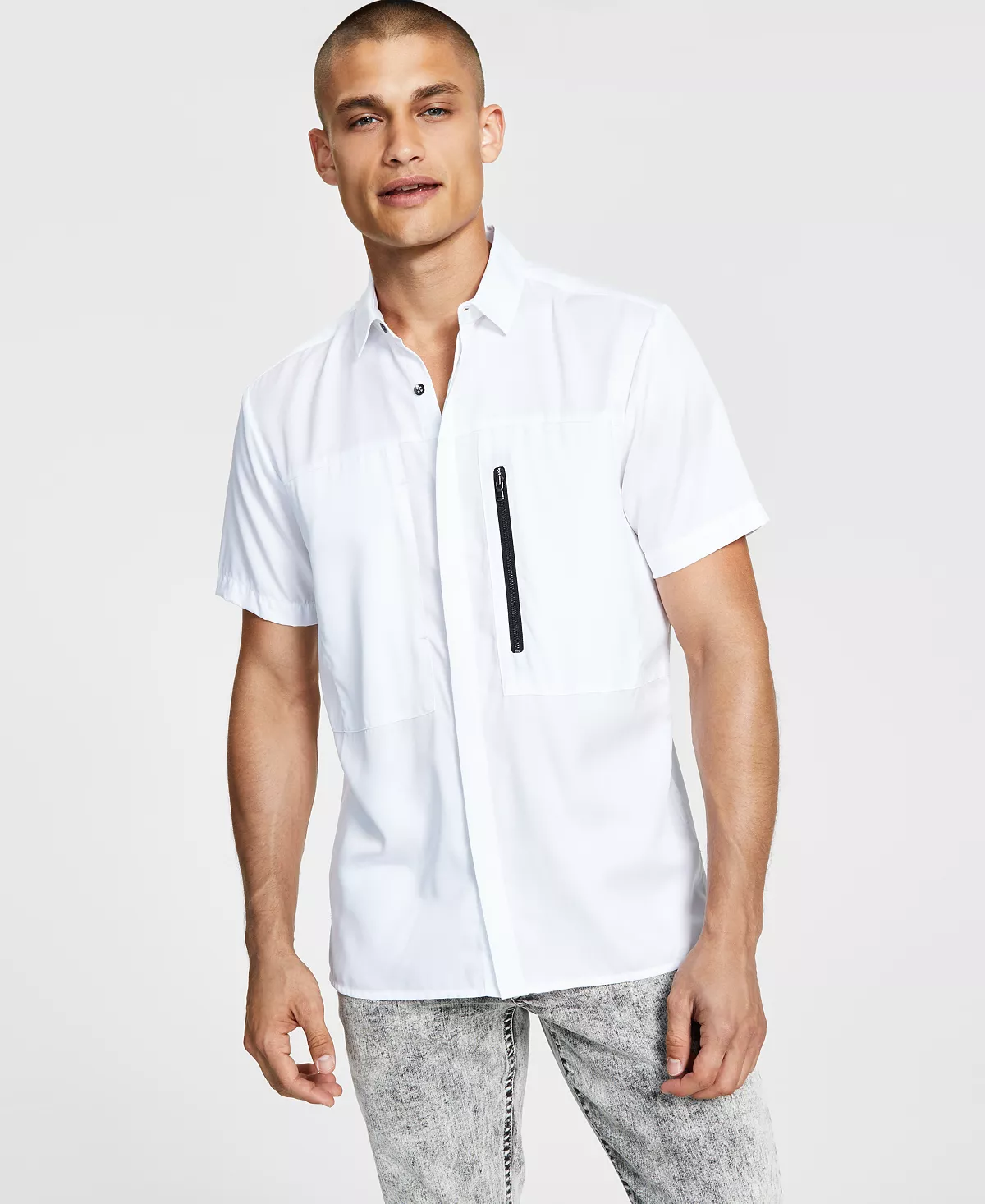 A classic button-down gets a stylish update with the vertical zipper pocket place at the chest of this breezy shirt from I.N.C. International Concepts®.