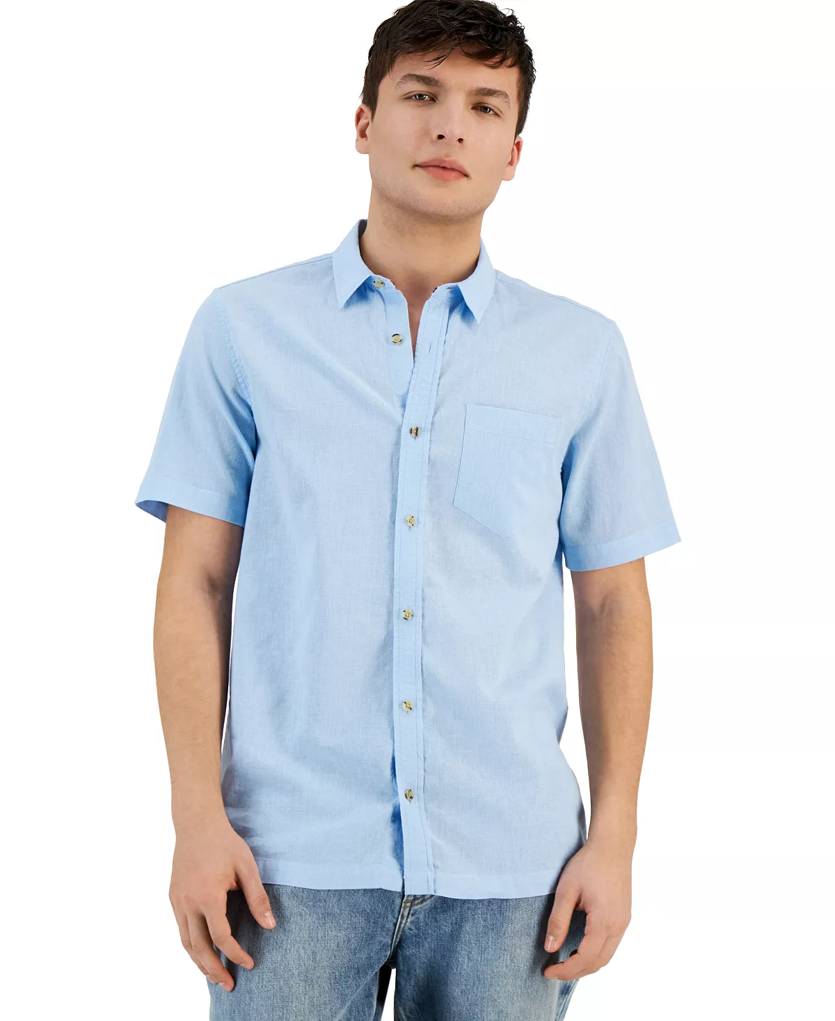Special details like the topstitching and striped buttons give this short-sleeve shirt from Sun + Stone an extra dose of modern style.